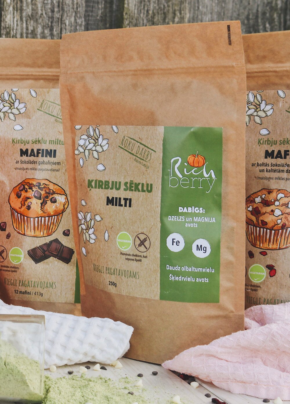 Mūsu misija ir dot iespēju patērētājam izvēlēties 100 % dabīgu, veselīgu un neizsakāmi garšīgu produktu, kura sastāvā nav izmantoti “baltie milti”. Pārstrādājam ķirbju sēklas miltos, kurus tālāk iekļaujam daudz dažādos sausos maisījumos, saldumos un citos gardos produktos.