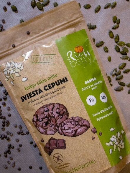 Gatavs ķirbju sēklu miltu maisījums sviesta cepumu mīklas pagatavošanai ar kakao pulveri. Vegāns bezglutēna produkts, piemērots cilvēkiem, kas nepanes uzturā lipekli (jeb glutēnu).